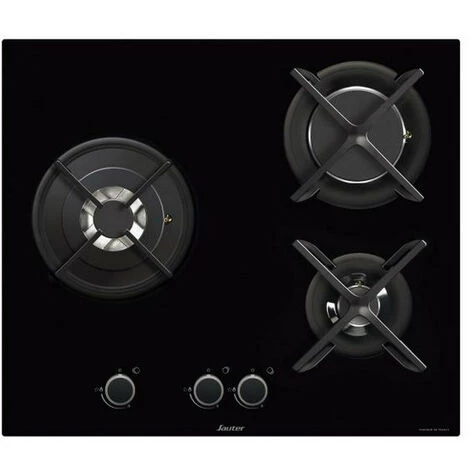 Table de cuisson gaz Sauter SPG9367B avec dessus en verre trempé et grilles fonte. Elle est dotée de 3 brûleurs dont 1 triple couronne 3,6 kW.